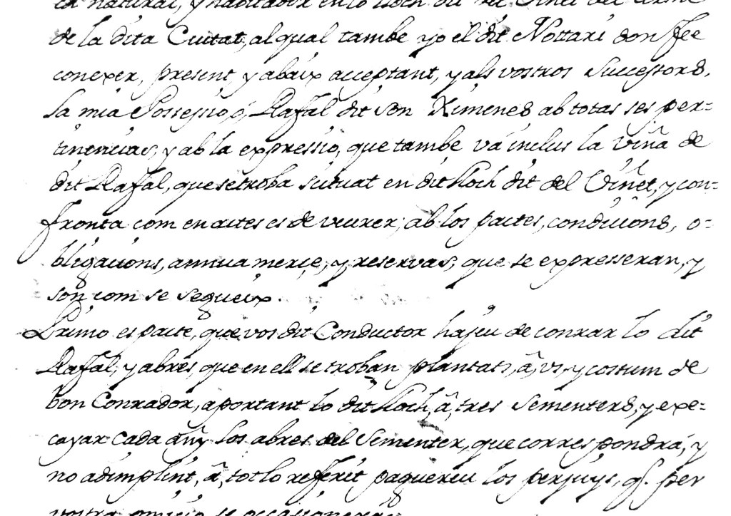 Primo, és pacte que vós, dit conductor, hajeu de conrar lo dit rafal y abres que en ell se troban plantats a ús y costum de bon conrador, aportant-lo dit lloch a tres sementers, y execayar cada añy los abres del sementer que correspondrà. Y no adimplint a tot lo referit, paguereu los perjuys q. per vostra omició se occasioneran.